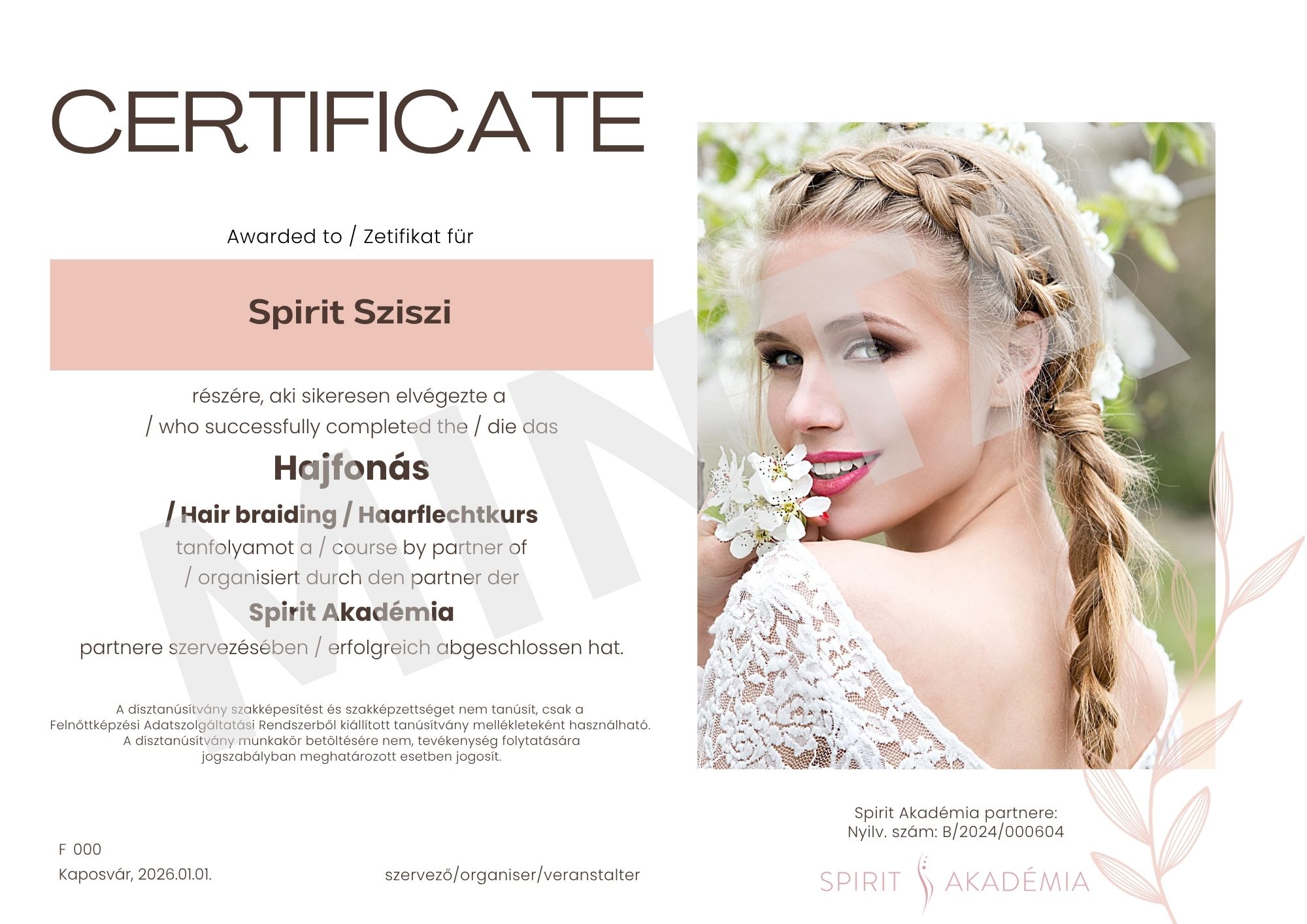 A képzés végén nincs vizsga. A tanfolyam elvégzéséről hivatalos Tanúsítványt állítunk ki. Meglepünk egy szép, magyar-angol-német nyelvű dísztanúsítvánnyal is. Ezeket postai úton küldjük meg címedre.